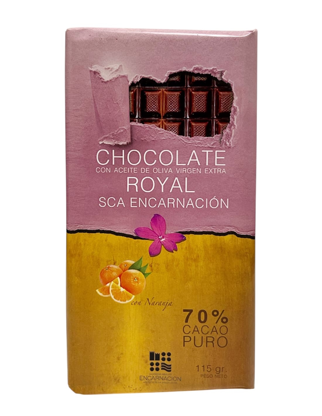 Handgefertigte Schokolade mit 70 % Kakaoanteil, hergestellt aus reinem Kakao mit Orangen und nativem Olivenöl extra der Sorte Royal der Genossenschaft S.C.A. Encarnación.