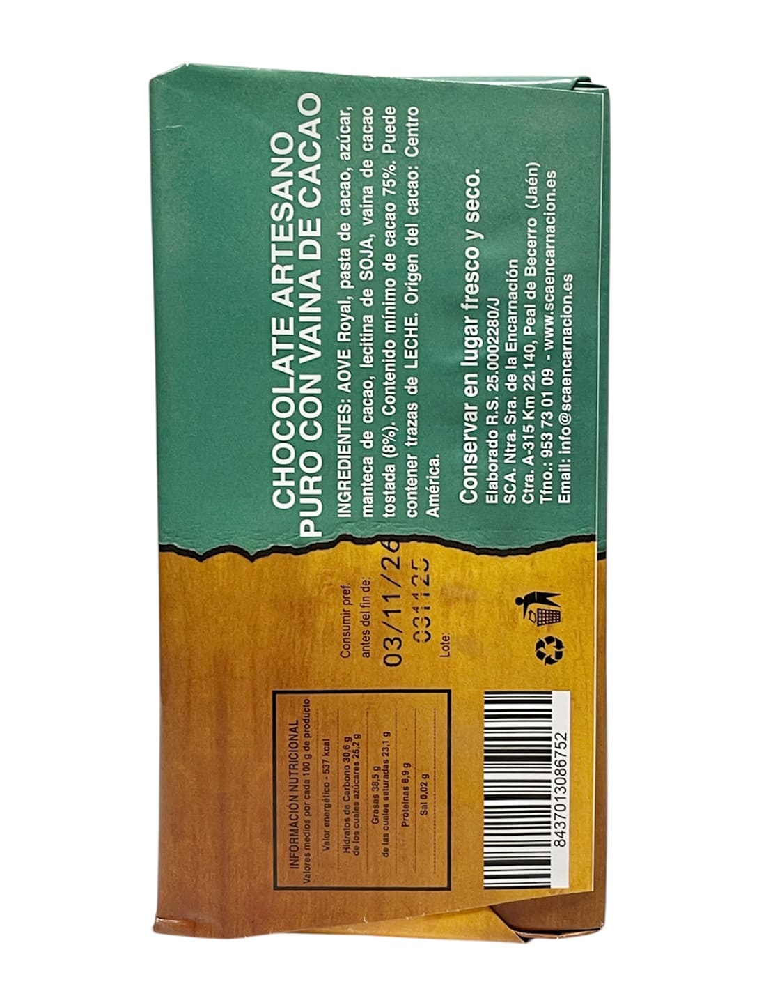75% chocolate made using traditional methods, combining pure cocoa, cocoa pod and extra virgin olive oil from the Royal variety of the Cooperativa S.C.A. Encarnación.