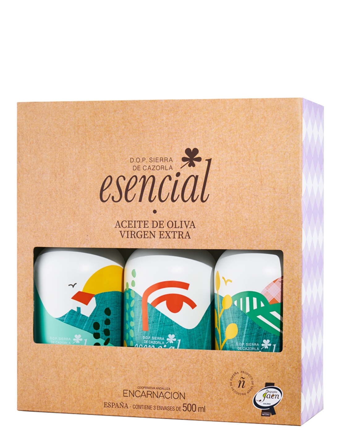 Extra Virgin Olive Oil from Peal de Becerro (Jaén, Spain) produced by the cooperative Nuestra Señora de la Encarnación. This case includes three bottles of 500 ml of different varieties: