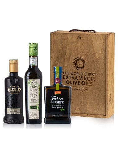 These exceptional oils are presented in an elegant wooden box containing 3 bottles of 500 ml. each, accompanied by a certificate attesting to their award.