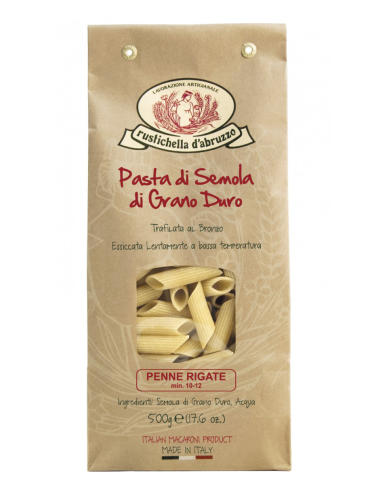 Penne rigate from Rustichella d'Abruzzo is a pasta made using a bronze stretching process and is slowly dried to obtain a rough, porous surface that absorbs the seasonings perfectly.
