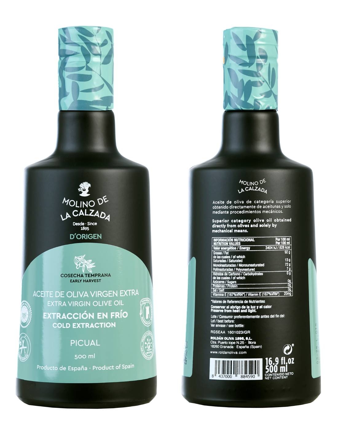 - Molino de la Calzada Picual: Aroma frutado intenso de aceituna verde, con gran complejidad olfativa, destacando los tonos verdes de hierba, tomate, almendra y manzana verde, así como hierbas aromáticas como la menta. En boca, la entrada es suave y se perciben todas las notas olfativas. El amargor es suave, con una intensidad tardía y gradual.