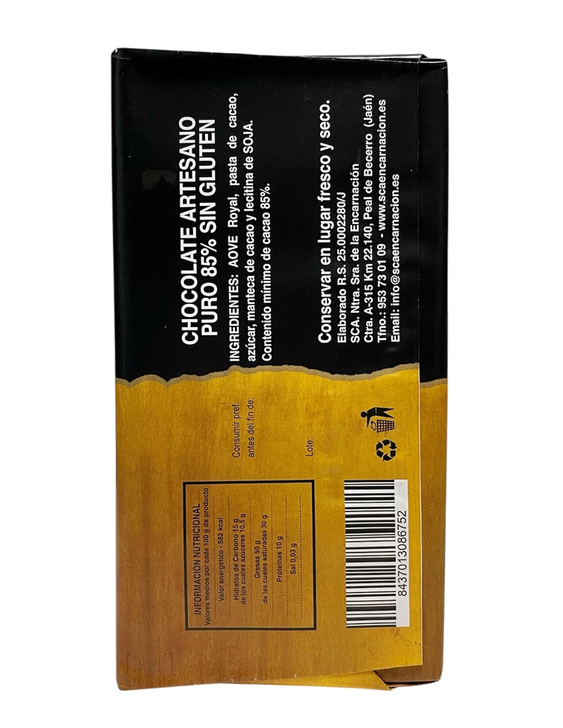 Chocolate 85% elaborado de forma artesanal, combinando cacao puro con aceite de oliva virgen extra de la variedad Royal de la Cooperativa S.C.A. Encarnación.