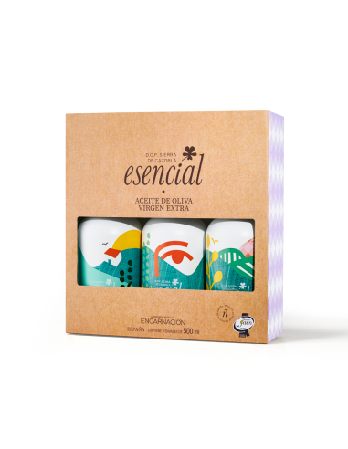 Aceite de Oliva Virgen Extra de Peal de Becerro (Jaén, España) elaborado por la cooperativa Nuestra Señora de la Encarnación. Este estuche incluye tres botellas de 500ml de diferentes variedades: