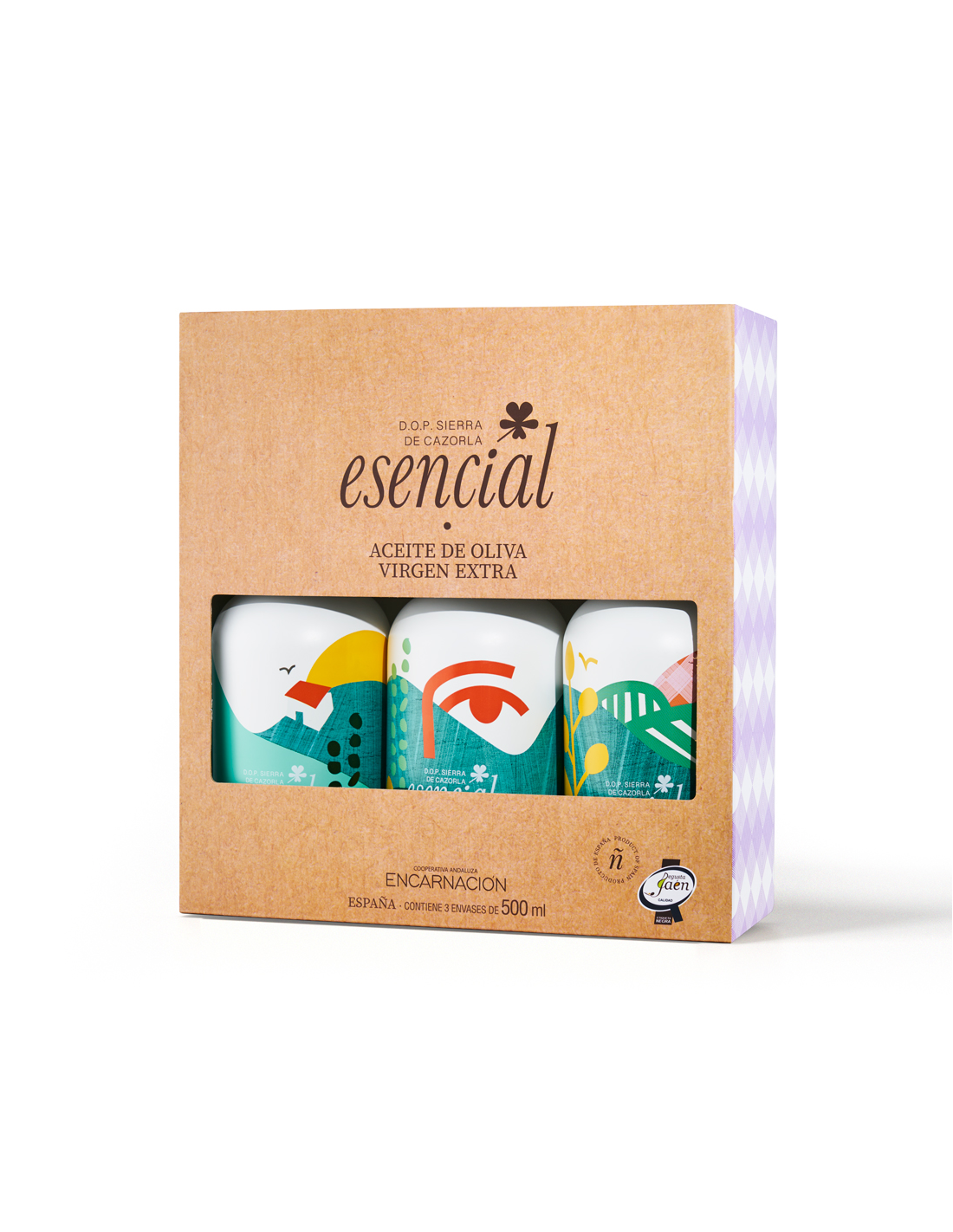 Aceite de Oliva Virgen Extra de Peal de Becerro (Jaén, España) elaborado por la cooperativa Nuestra Señora de la Encarnación. Este estuche incluye tres botellas de 500ml de diferentes variedades:
