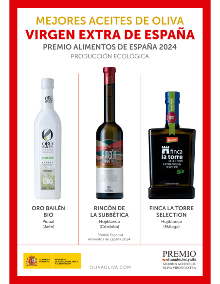 Se premia a los mejores aceites de oliva virgen extra españoles en tres categorías: Mejor Frutado Verde Amargo, Mejor Frutado Verde Dulce y Mejor Frutado Maduro. A su vez, el aceite que obtiene mayor puntuación total es galardonado con el Premio Especial Alimentos de España Mejor Aceite de Oliva Virgen Extra.