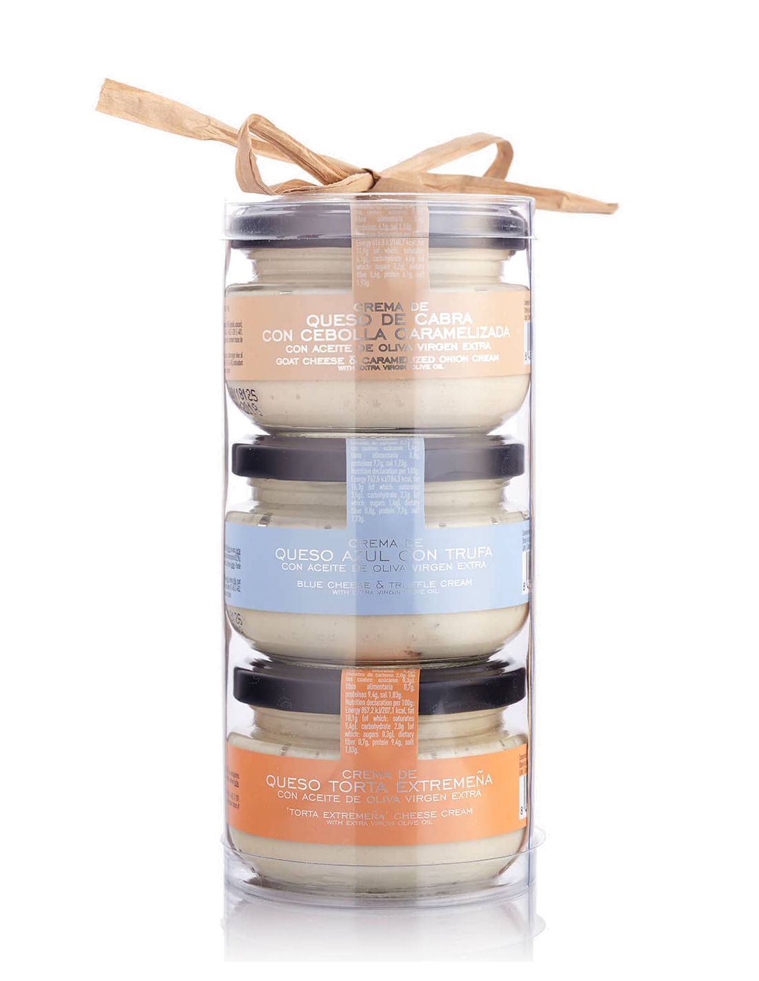 Este pack incluye la crema de queso de cabra con cebolla caramelizada, la crema de queso azul con trufa y la crema de queso torta extremeña.