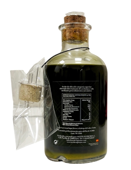 Aceite de Oliva Virgen Extra sin filtrar de la variedad Picual producido en Jaén.