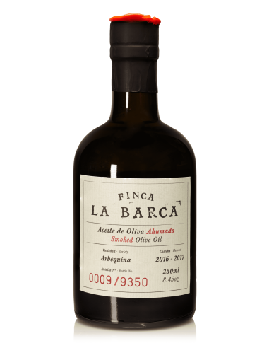L'huile d'olive de Finca La Barca est fumée selon la tradition de la région de "La Vera" en Estrémadure, en utilisant du bois de chêne de qualité supérieure. Après plus de 15 jours dans le "séchoir", l'huile acquiert des nuances fumées qui lui confèrent une nouvelle dimension de saveur et d'arôme.