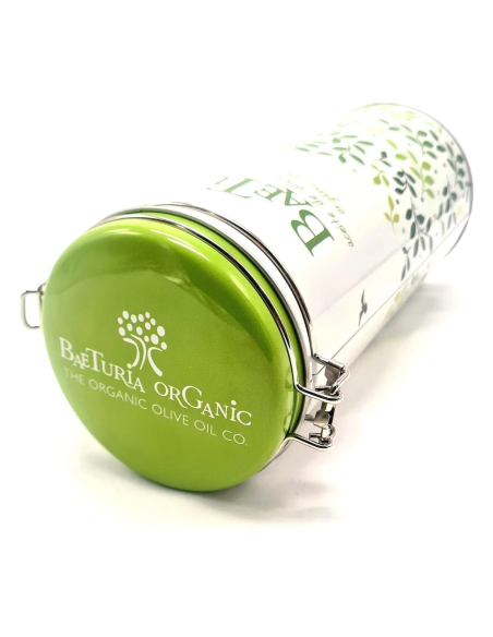 Huile d'olive vierge extra biologique de la variété Morisca de couleur vert-or. Édition limitée dans un coffret métallique.