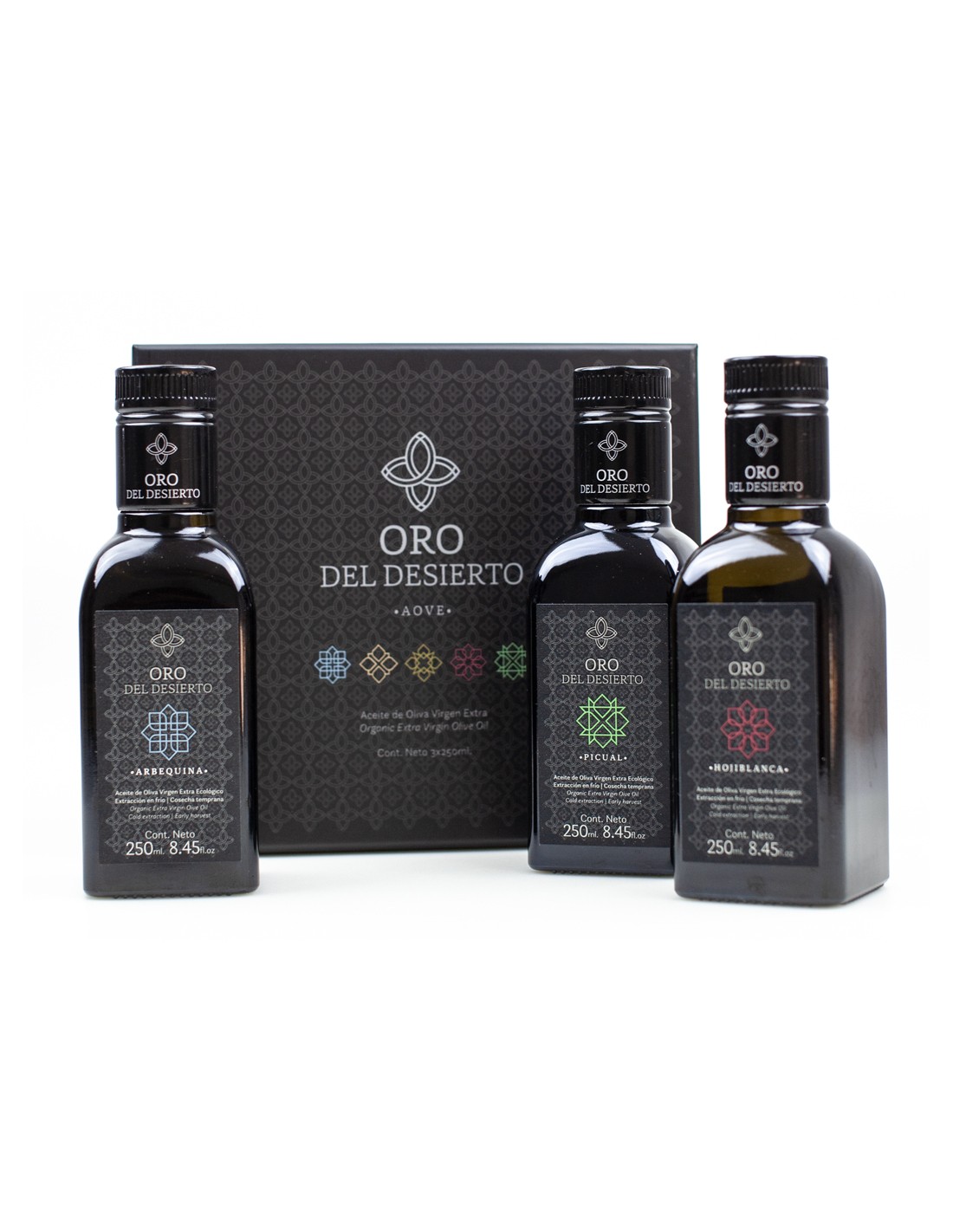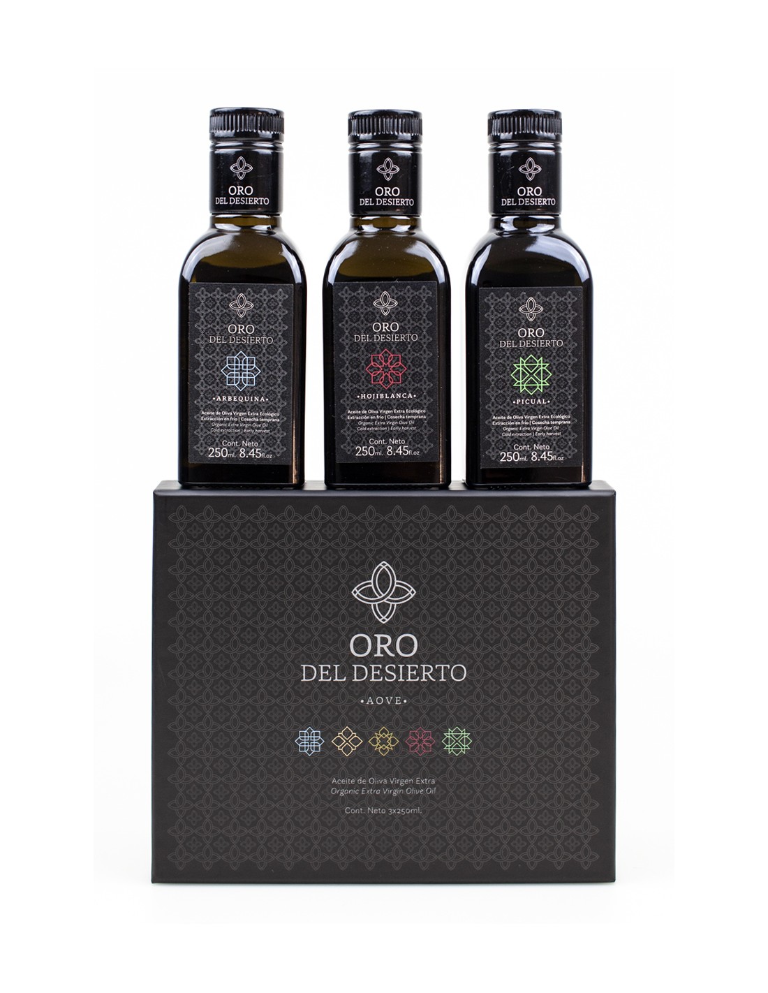 Coffret contenant 3 flacons de 250 ml.: Oro del Desierto Arbequina, Oro del Desierto Hojiblanca et Oro del Desierto Picual.