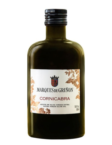 Huile d'olive vierge extra provenant d'oliviers centenaires de la variété Cornicabra, de couleur légèrement verdâtre et brillante.