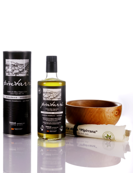 Ce pack comprend une « hortera » ou « dornillo » pour 2 personnes, un étui de 700 ml. d'huile d'olive vierge extra biologique Pintarré Véraison BIO Récolte Précoce et la recette de l'authentique Pipirrana.