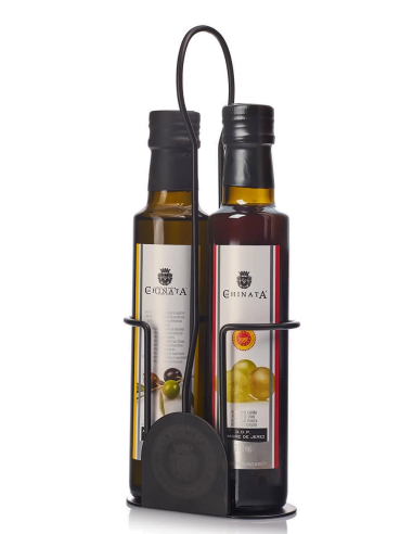 Le duo huile et vinaigre de Xérès La Chinata avec Appellation d'Origine Protégée est la combinaison parfaite pour servir à table, avec une présentation soignée dans une élégante structure métallique, confortable, légère et facile à manipuler.