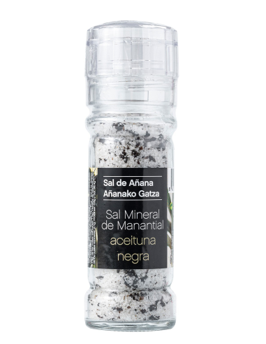 Sel minéral de source avec olives noires déshydratées. Il est parfait pour rehausser la saveur de tous types de plats tout en leur apportant une subtile touche distinctive d'olives noires. Des chefs prestigieux comme Dani García, Joan Roca et Martin Berasategui l'utilisent dans leur cuisine.