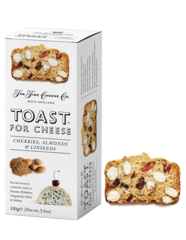 C'est un toast aux cerises, amandes et graines de lin. Il est croquant, léger et fin, il contientg60 % de traces de fruits, de noix et de graines. Idéal avec les fromages bleus tels que la Fourme S'Ambert, le Stilton et le Gorgonzola Dolce, le meilleur apéritif.